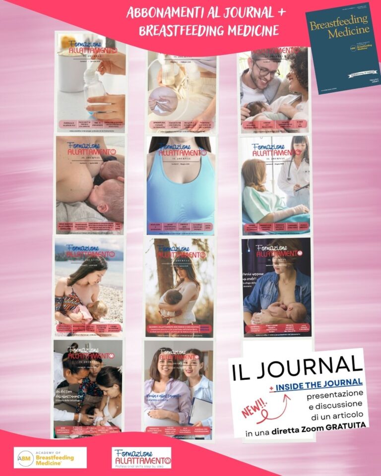 Insieme al Journal di formazione Allattamento, avrai accesso anche all’intera annualità della rivista ufficiale dell’Accademy of Breastfeeding Medicine (ABM). In questo modo potrai avere accesso non solo ai nostri articoli in italiano, ma approfondirli direttamente nell’originale inglese in versione full access. Troverai anche tutti gli articoli che non verranno da noi selezionati per la traduzione.